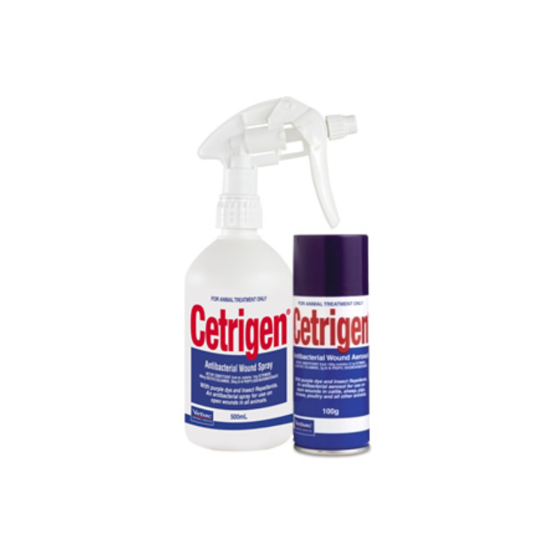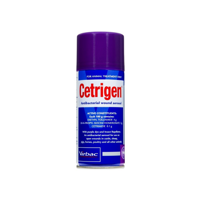 CETRIGEN® Antibacterial Wound Spray is a topical antiseptic solution designed to aid in the treatment and healing of superficial wounds in animals. Formulated with cetrimide and DEET, it not only disinfects but also repels insects, reducing the risk of wound contamination and fly strike. The distinctive purple dye ensures complete coverage, allowing for easy identification of treated areas.